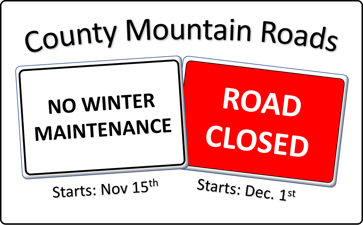 County road maintenance of the mountain roads is ending on November 15th and access to the mountain roads for conventional motor vehicle traffic ends December 1st. See link for more information.
